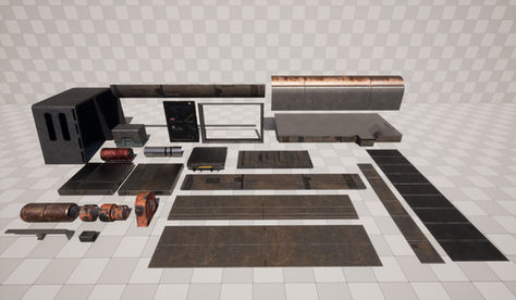 I also made a spline mesh for the pipes, light function for the flickering and an asset randomizer blueprint for the containers.